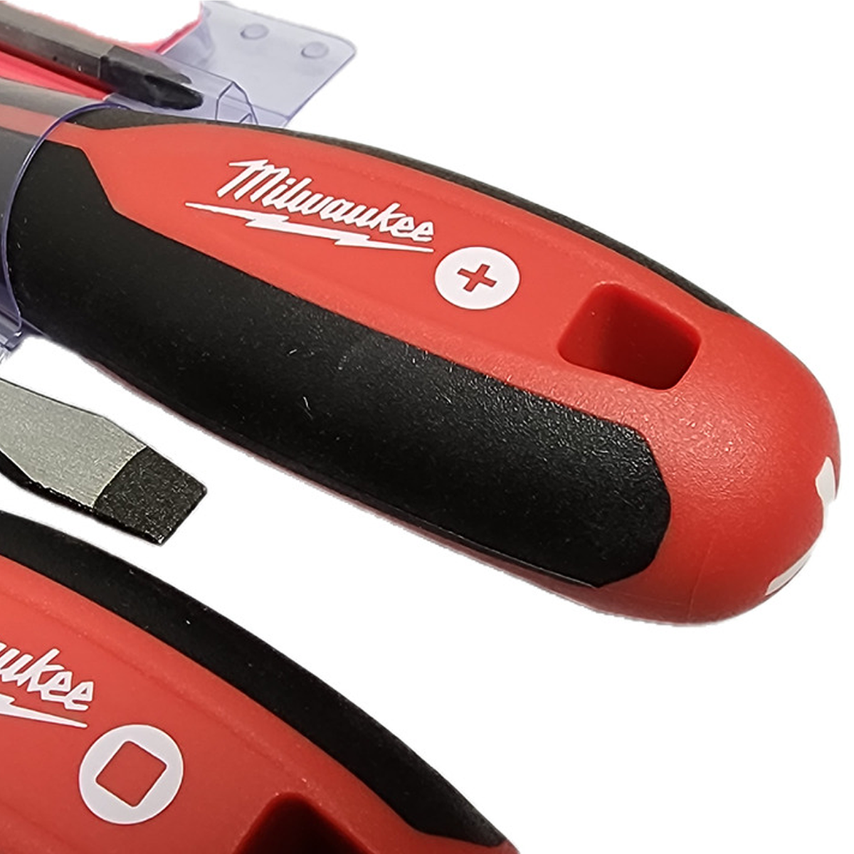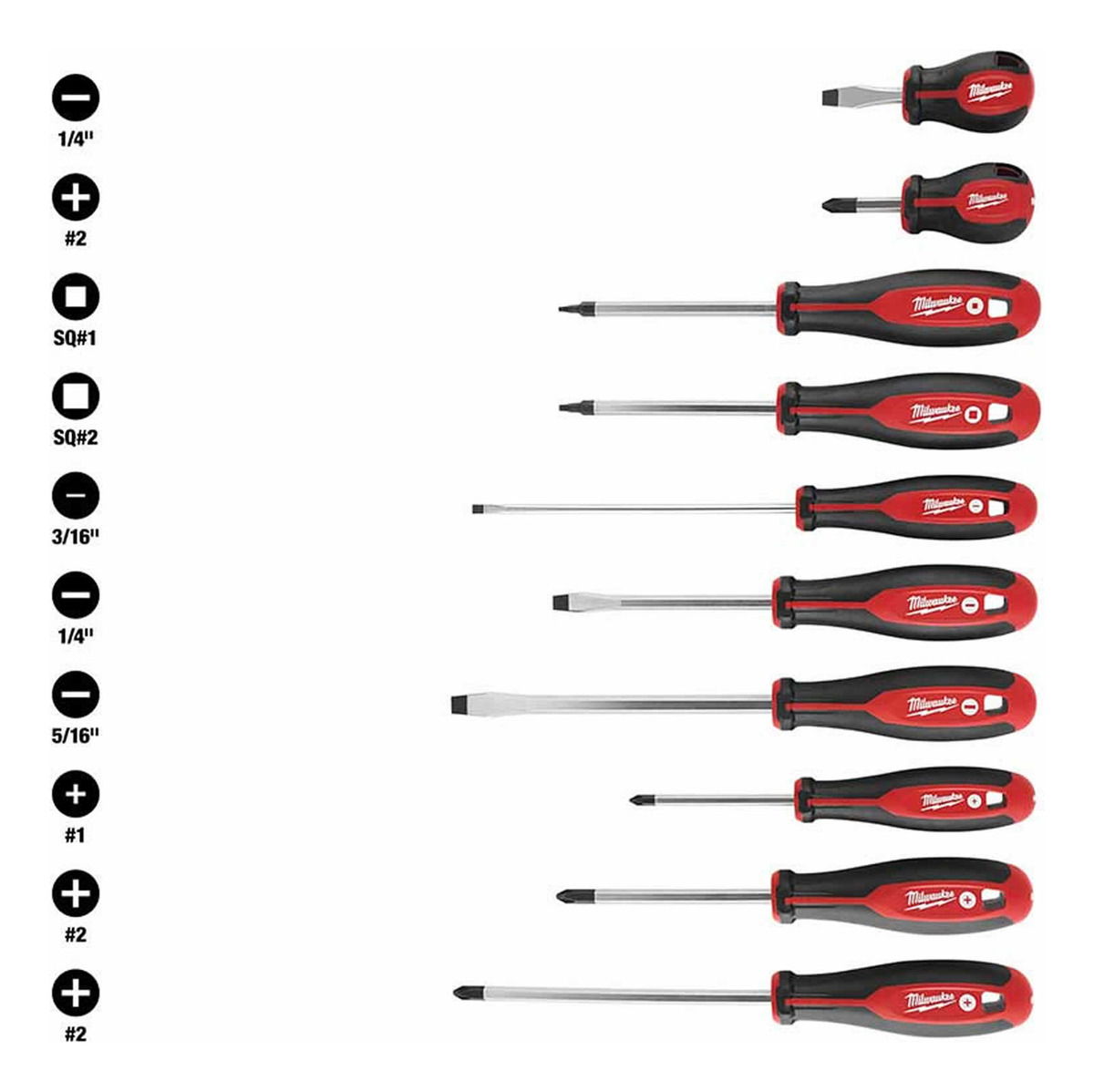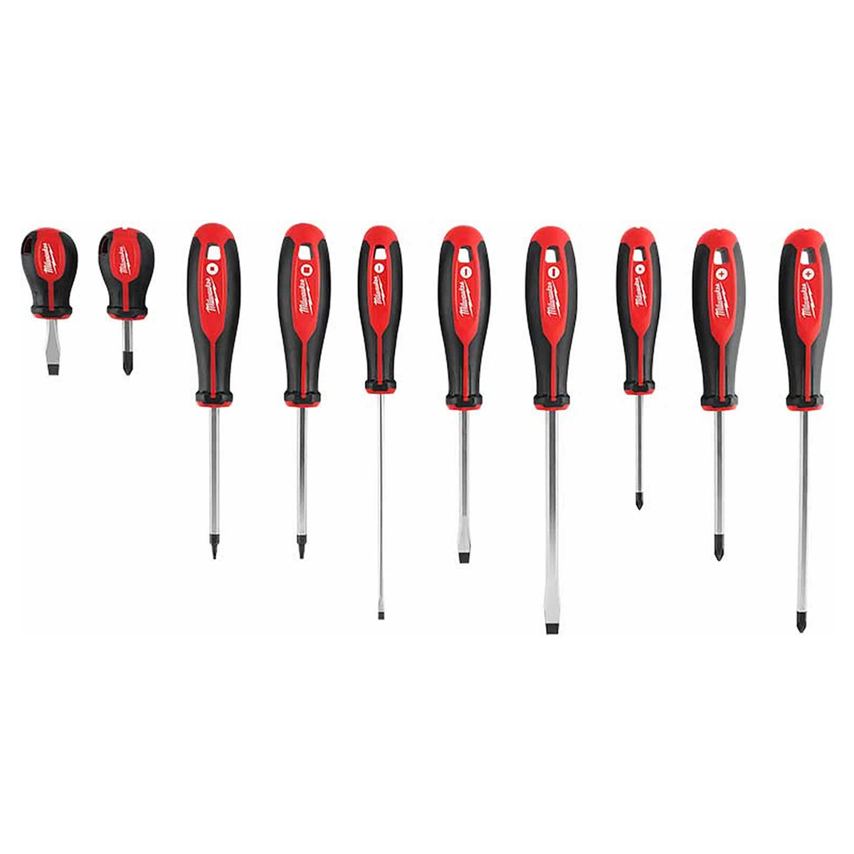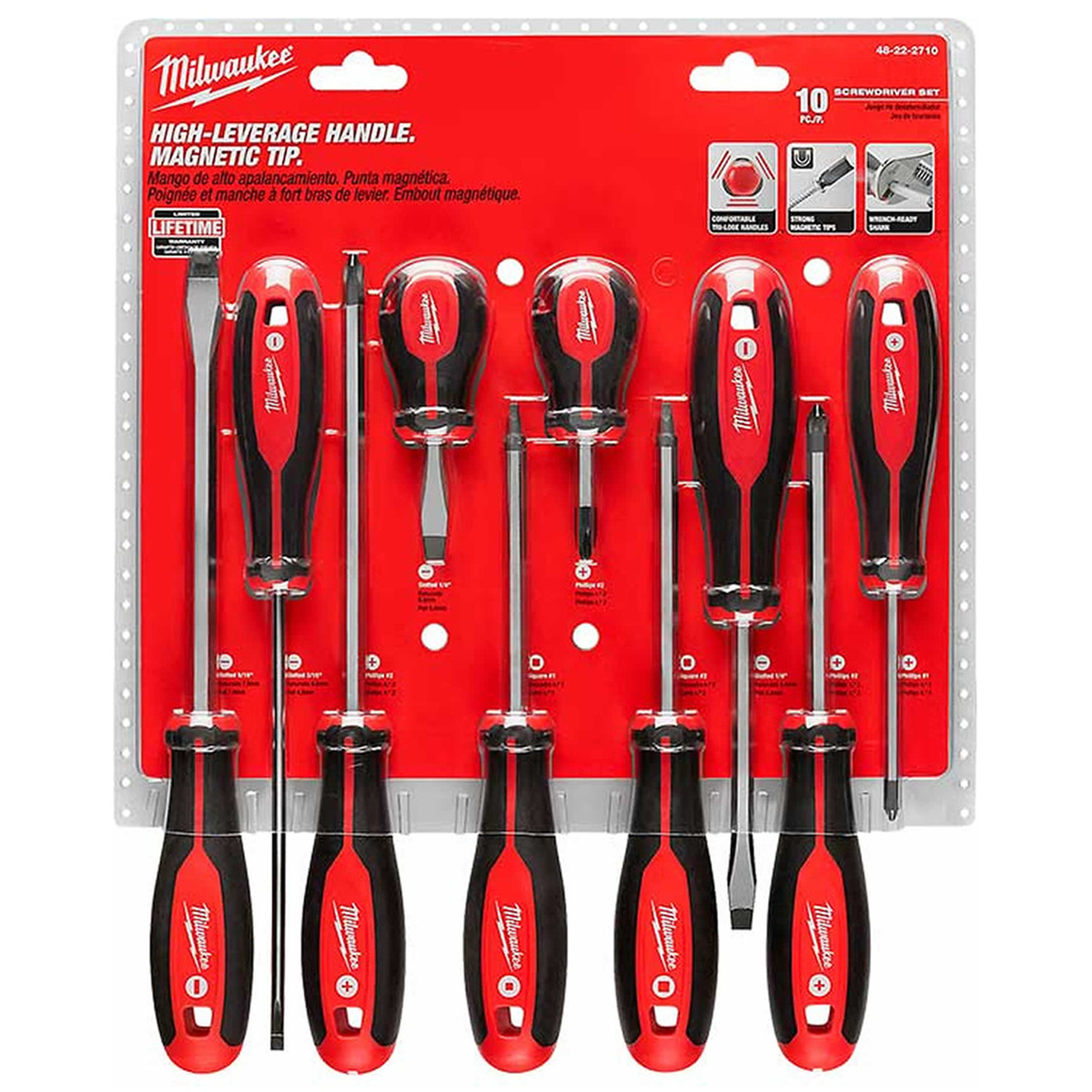 El juego de 10 destornilladores de Milwaukee®, que cuenta con puntas endurecidas y vástagos de acero forjado, proporciona soluciones de nivel profesional y durabilidad al usuario. Los tipos de puntas están marcados en la tapa de cada herramienta para lograr una rápida identificación y mayor eficiencia. El asa cómoda con tres lóbulos permite a los usuarios aplicar más apalancamiento de manera cómoda.