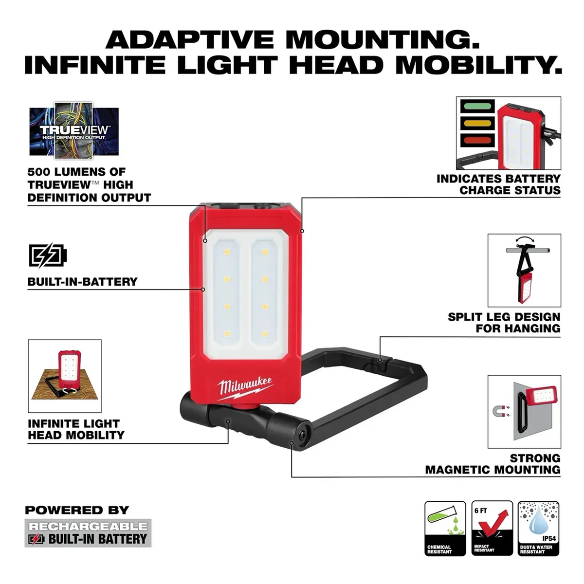 Nuestra luz de trabajo magnética de perfil bajo recargable ofrece capacidad de MONTAJE ADAPTATIVO junto con MOVILIDAD DE CABEZAL DE LUZ INFINITA en todas las direcciones. Esta luz de trabajo recargable está diseñada con un marco de aluminio duradero que incluye imanes y una función de montaje alternativa para superficies no metálicas, todo en un diseño portátil de bolsillo. Para ayudar a mejorar la visibilidad y reducir las sombras, el cabezal de luz tiene una movilidad horizontal y vertical infinita. Administre tres modos de salida para 500 lúmenes de salida de alta definición TRUEVIEW™ o extienda el tiempo de operación hasta 12 horas en la configuración baja. La luz de trabajo magnética recargable de bajo perfil de MILWAUKEE® es recargable por USB-C y está diseñada para resistir las condiciones más difíciles en el lugar de trabajo, con una clasificación IP54 a prueba de agua y polvo y una clasificación de impacto de 6 pies. La luz de tarea magnética de perfil bajo cuenta con una garantía de 2 años.